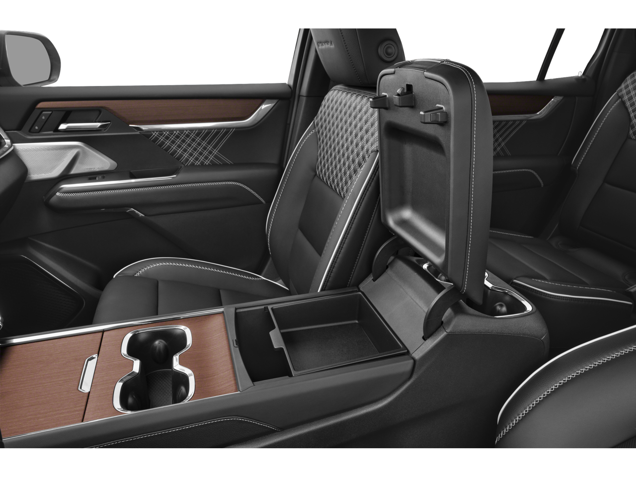 - Console, front center with 4 cup holders and storage, includes rear storage